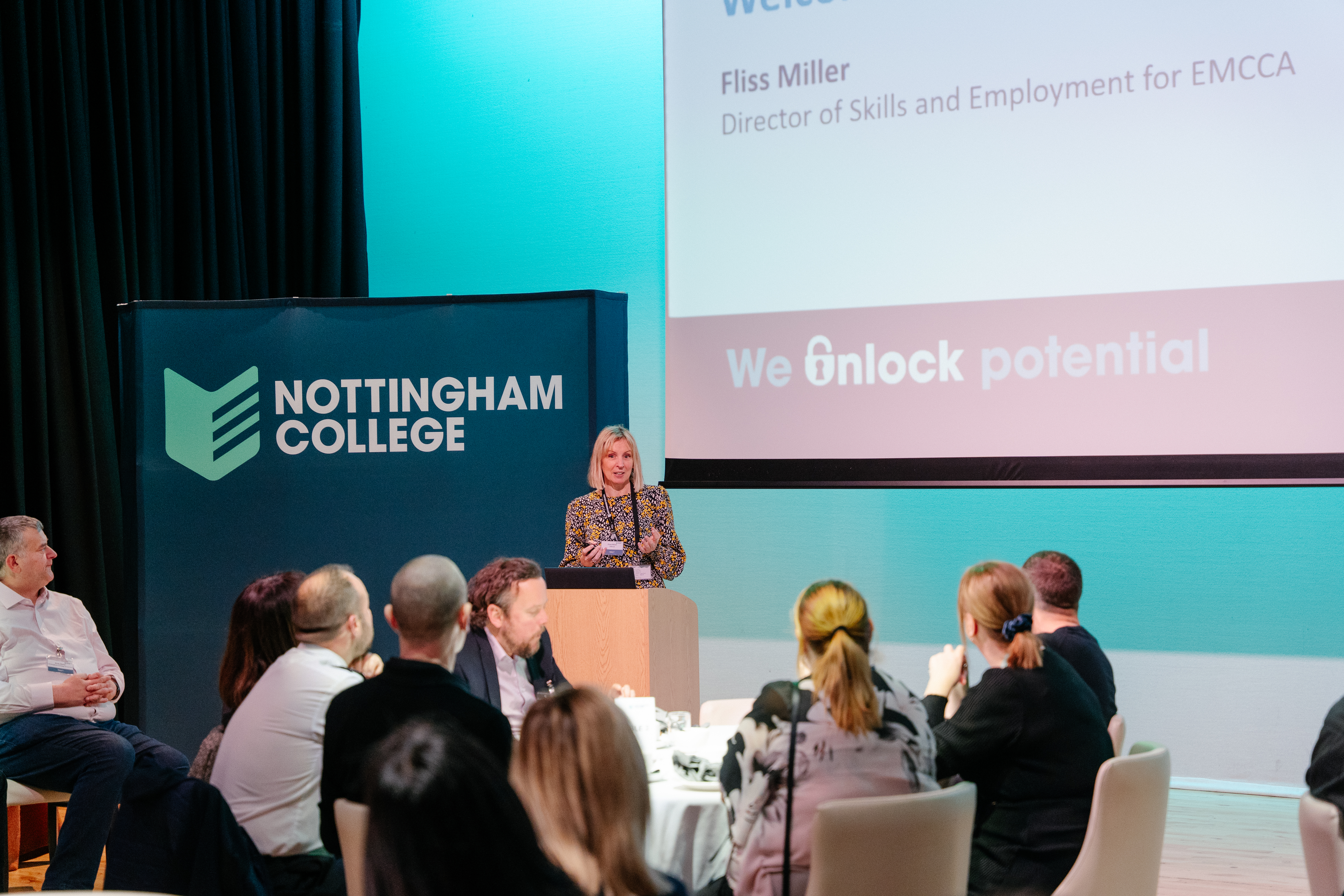Fliss Miller, Director of Employment and Skills at EMCCA, opened the afternoon with a keynote speech highlighting the vital role of FE and colleges in driving inclusive growth across the region. Her address focused on breaking down barriers, widening access to higher‑level skills, and ensuring more local people can progress into quality training and employment.
